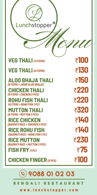 We at Lunch Stopper have tried to initiate some most desired dishes to reach your taste buds within your pocket. We started off as a small initiative in Salt Lake sector V. But within no time our dedication towards our customers and our service has gained faith and fame. Our customers are our assets we look into all the pros and cons while preparing food. The food is prepared while maintaining all hygiene and nutritional benefits. Looking into the ladies at home and at work place, who does not get any time for themselves, we have consider to deliver food at your door step at very cheap and convenient price, so that ladies can spend some time with friends and family and can pamper themselves. We have initiated various snacks and Bengali thalis which can satisfy your taste buds on daily basis. The huge ranges of dishes which we have offered to you are authentic Bengali dishes.